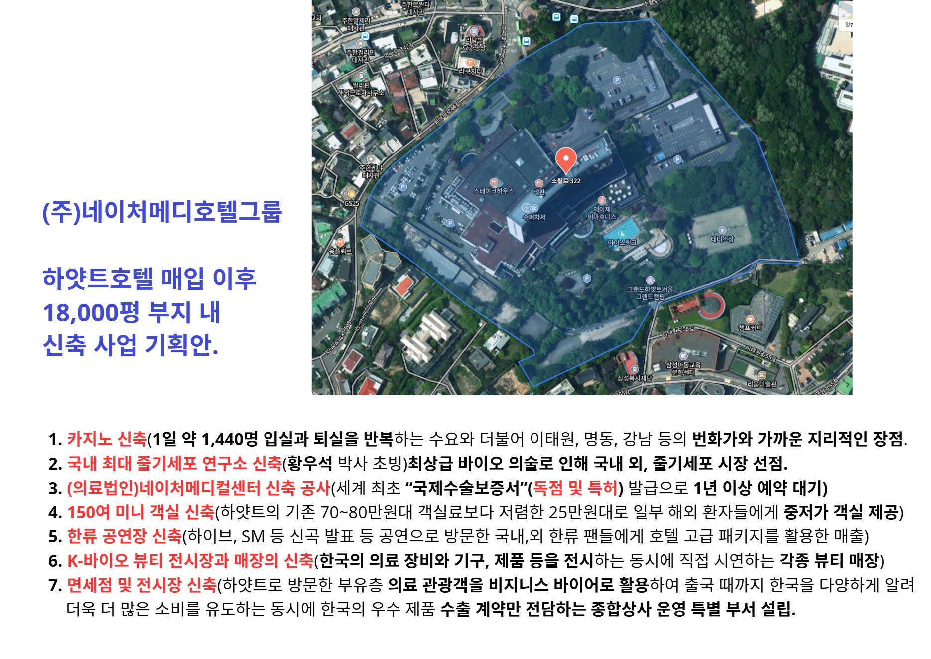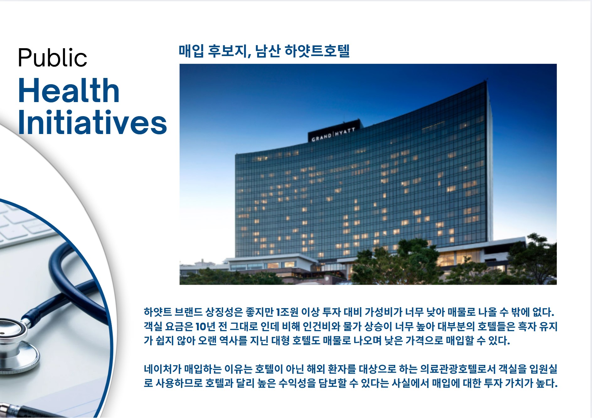 호텔에 투숙할 수 없는 암, 바이러스, 중증 환자는 주변 대학병원으로 보내어 수수료를 취하고 미용과 건강 관련 의료만 진료하는 종합병원.